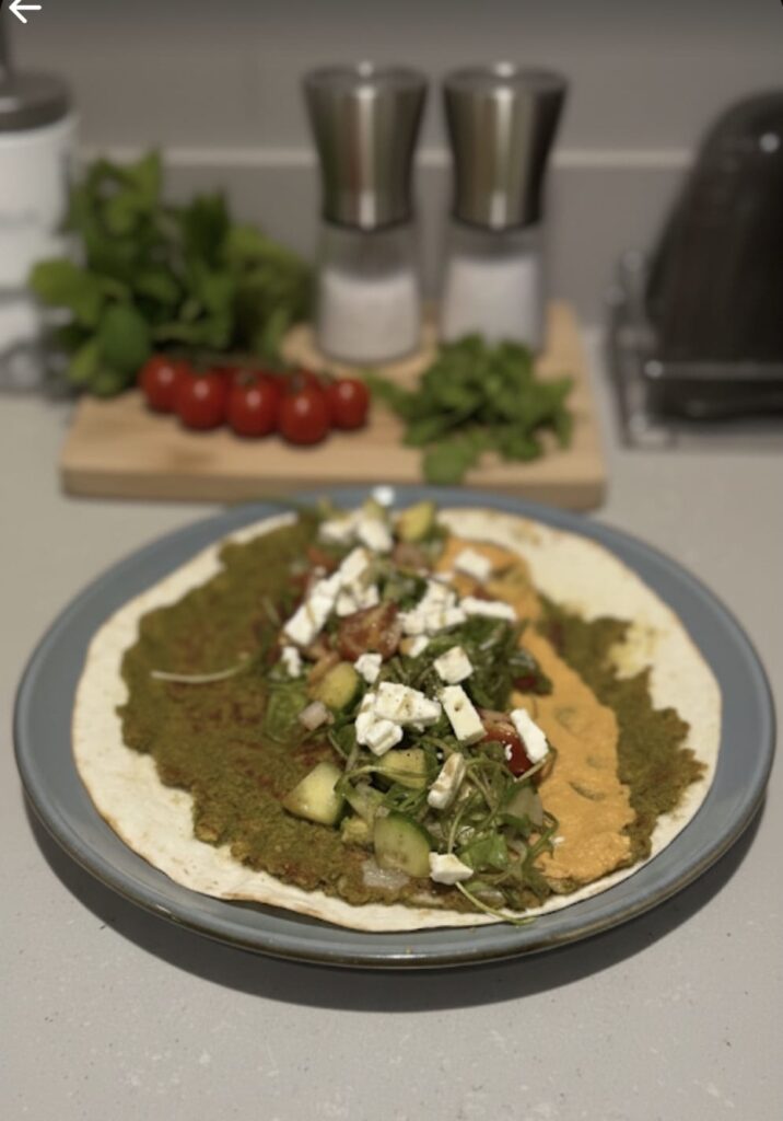 Bak de wrap in een pan met een scheut olijfolie, eerst met de falafelkant naar beneden (± 5 minuten) tot goudbruin.
